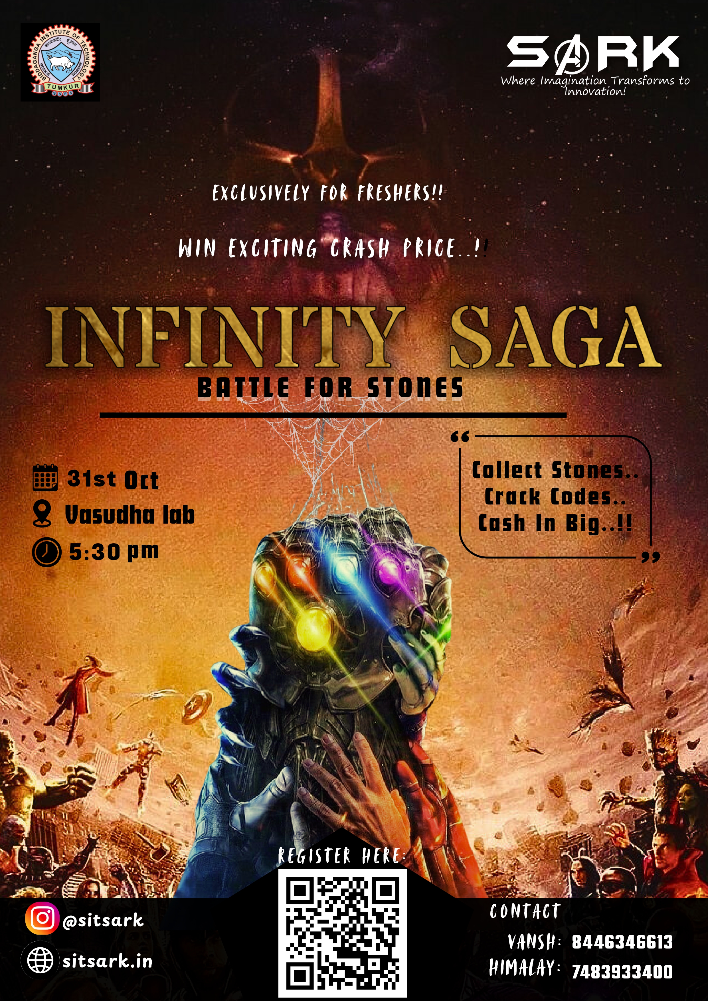 π₯ SARK PRESENTS: INFINITY SAGA β BATTLE FOR STONES! π₯ π« Eligibility: Exclusively for Freshers! Whether youβre a strategist like Tony Stark or a problem-solver like Shuri β this is your chance to shine!